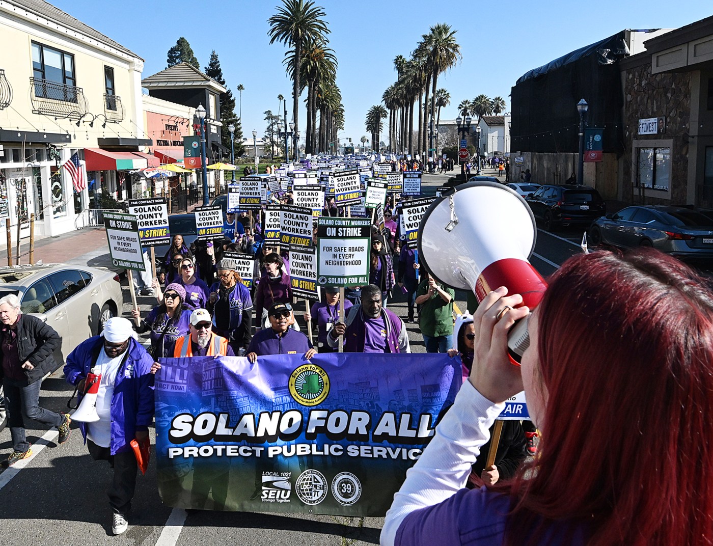 Demonstrations were held at six locations throughout Solano County. Workers gathered outside the Solano Health and Human Services building early in the morning, with about 150 attendees at the Solano County Board of Supervisors meeting. More than a thousand workers later marched through downtown Fairfield, culminating in a demonstration outside the Solano County Government Center.