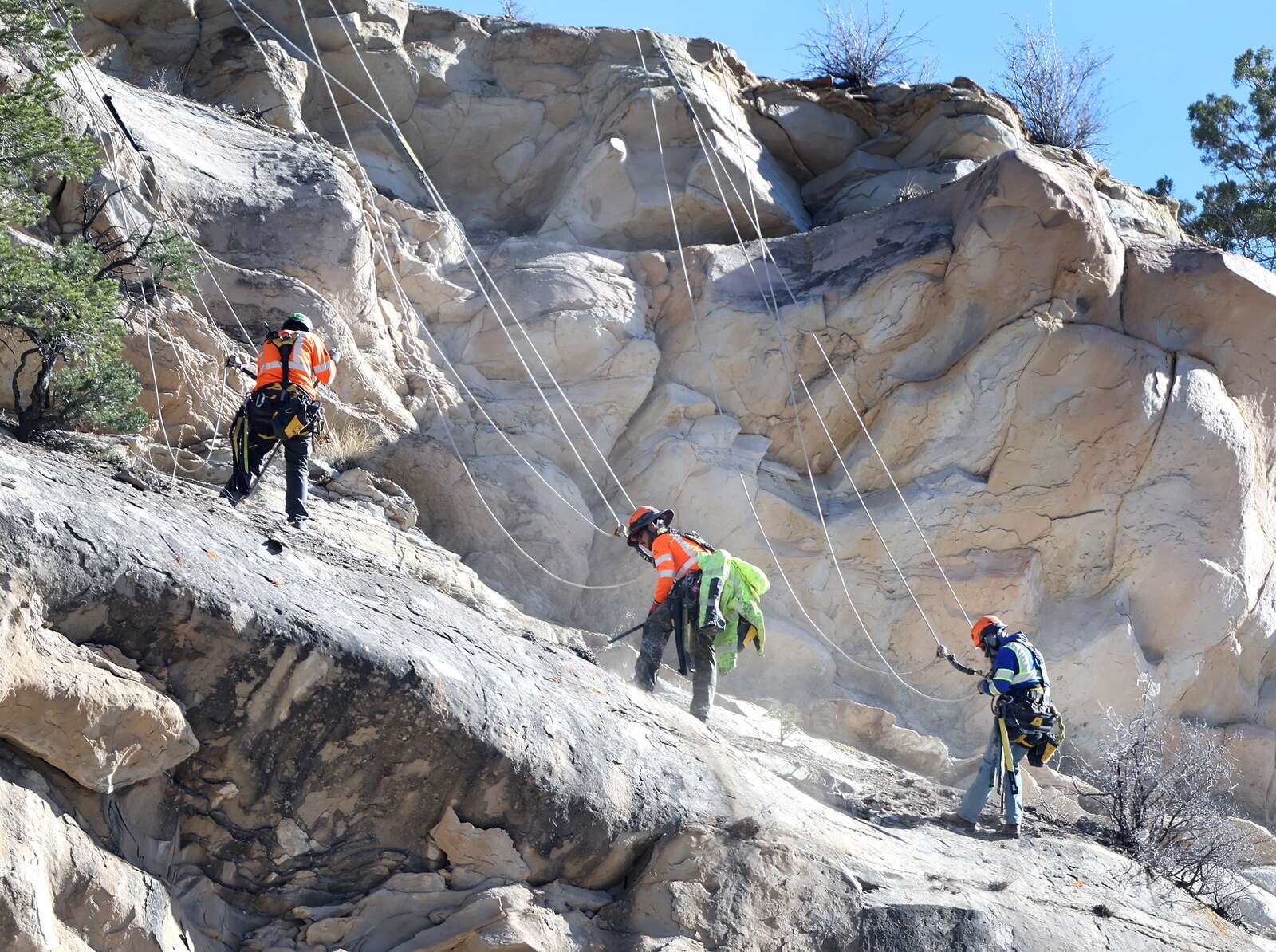 The first phase of the mitigation involves workers rappelling down the sandstone cliffs to remove loose rocks that could pose further risks. This initial step is crucial for ensuring a safe working environment for crews tasked with repairing the damaged fence.